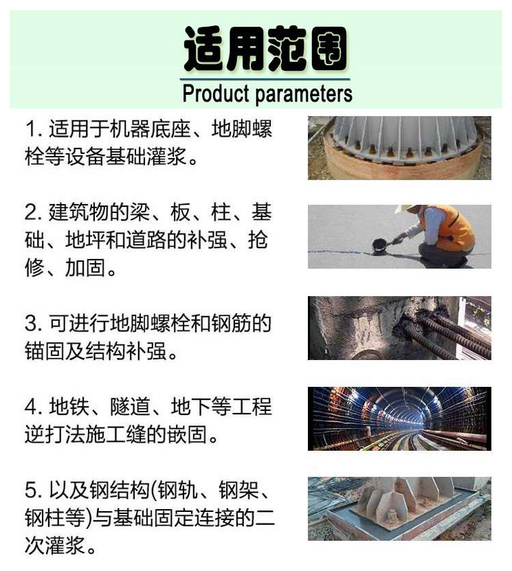 機器底座、鋼結構與地基懷口、設備基礎的二次灌漿、栽埋鋼筋、混凝十結構加固和改造,舊混凝土結構的裂縫治理,機電設備安裝,軌道及鋼結構安裝,靜力壓樁工程封樁,建筑加固,梁柱截面加大、墻體結構的加厚及漏滲水的修補,各種基礎工程的塌陷灌漿以及各種搶修工程等。